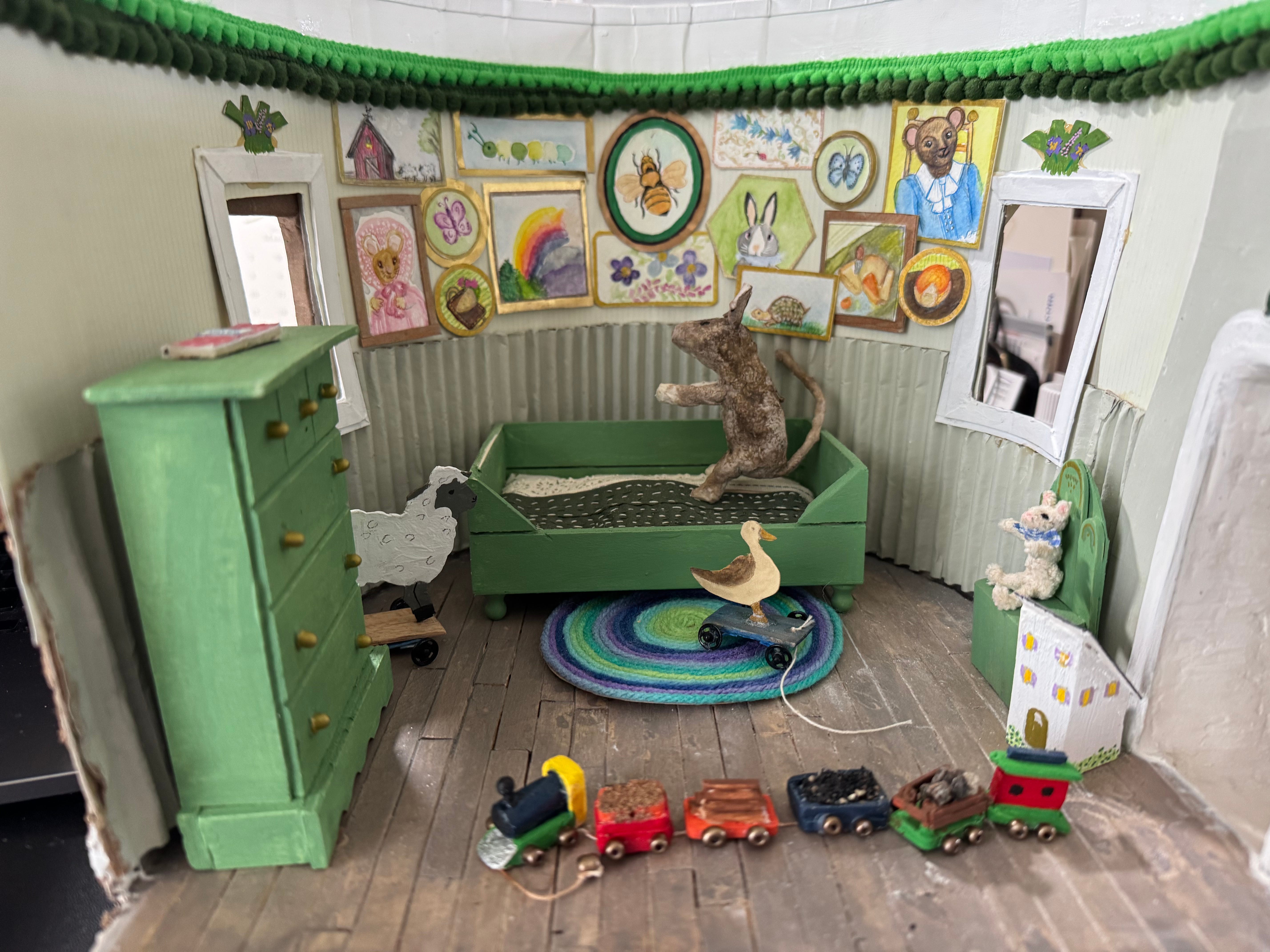 I have questions about your mouse house photo. Are those two windows on either side? What are the green things above them? And what’s behind the chest of drawers? My favorite things are the mouse kid art gallery, the train, and that braided rug! 💕🐭