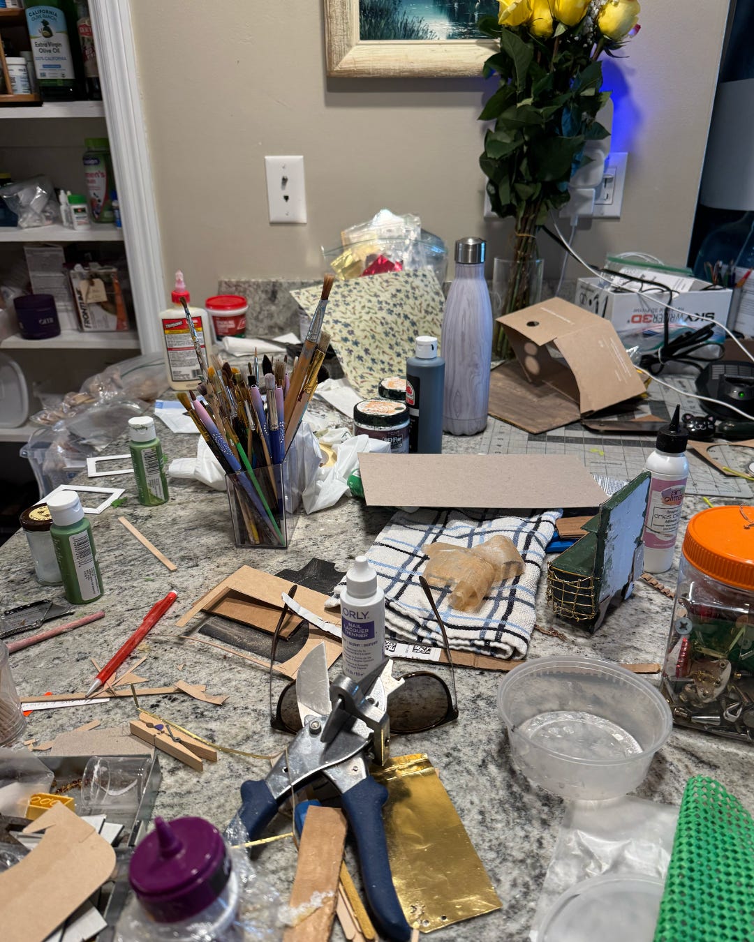 Years ago, a noted miniaturist told me I was one of the most creative people she’d ever met — but my execution stinks. She might be right about the execution part. I cannot, for the life of me, cut anything straight. I goof up. Right now I’m working on a mouse house, and it’s not going as planned. I’ve made a glorious mess in my kitchen.