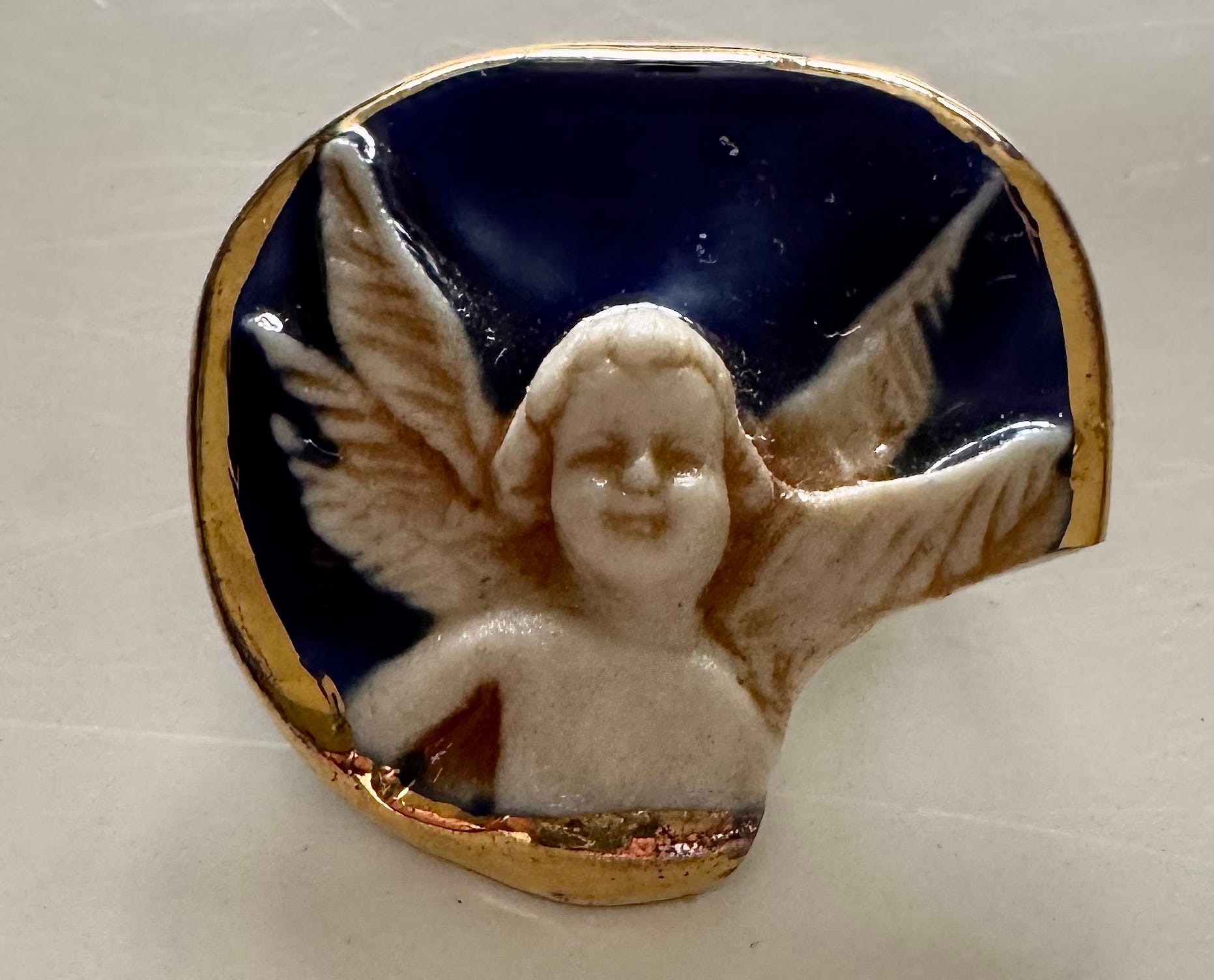Brooke’s specialty was ceramic pins, each with a story. This angel was part of a vase, a commissioned item that took many firings to complete. While it was cooling, one of Ms. Andrews’ cats knocked it off the table and broke it into pieces. After mourning the loss, Ms. Andrews turned the pieces into pins, such as the one I bought.